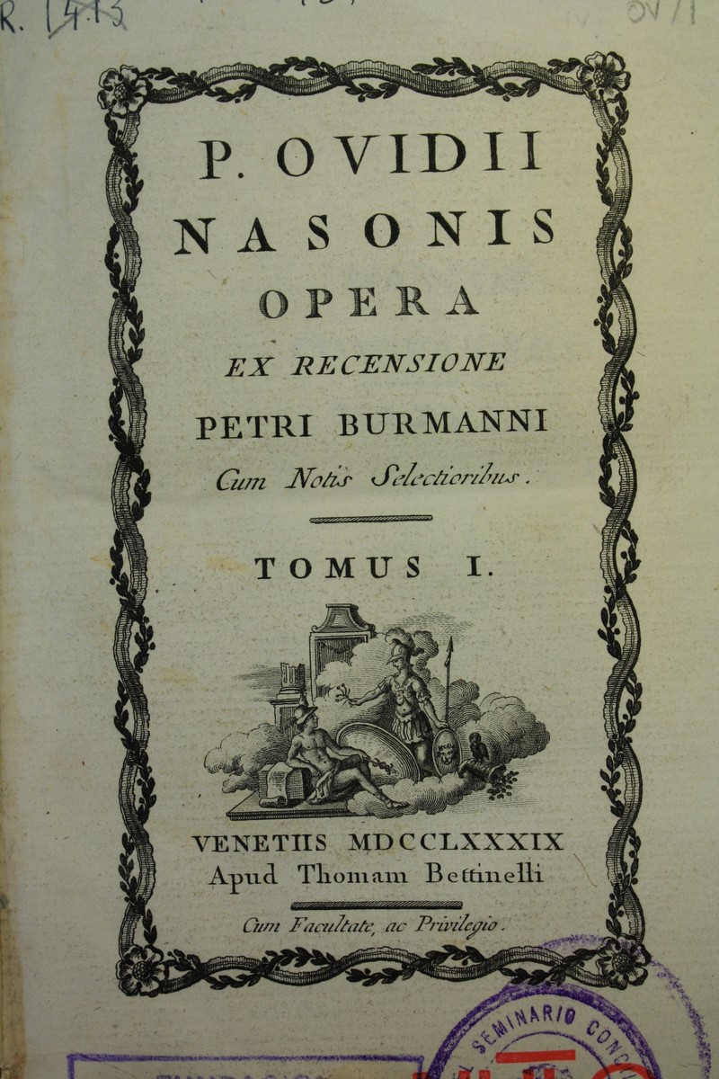Este tomo primero contiene además un frontispicio con un retrato de Ovidio realizado por el grabador e impresor Pietro Scattaglia. La imagen del poeta se inscribe en una especie de metopa que descansa sobre un arquitrabe dórico en el que se lee la inscripción:
